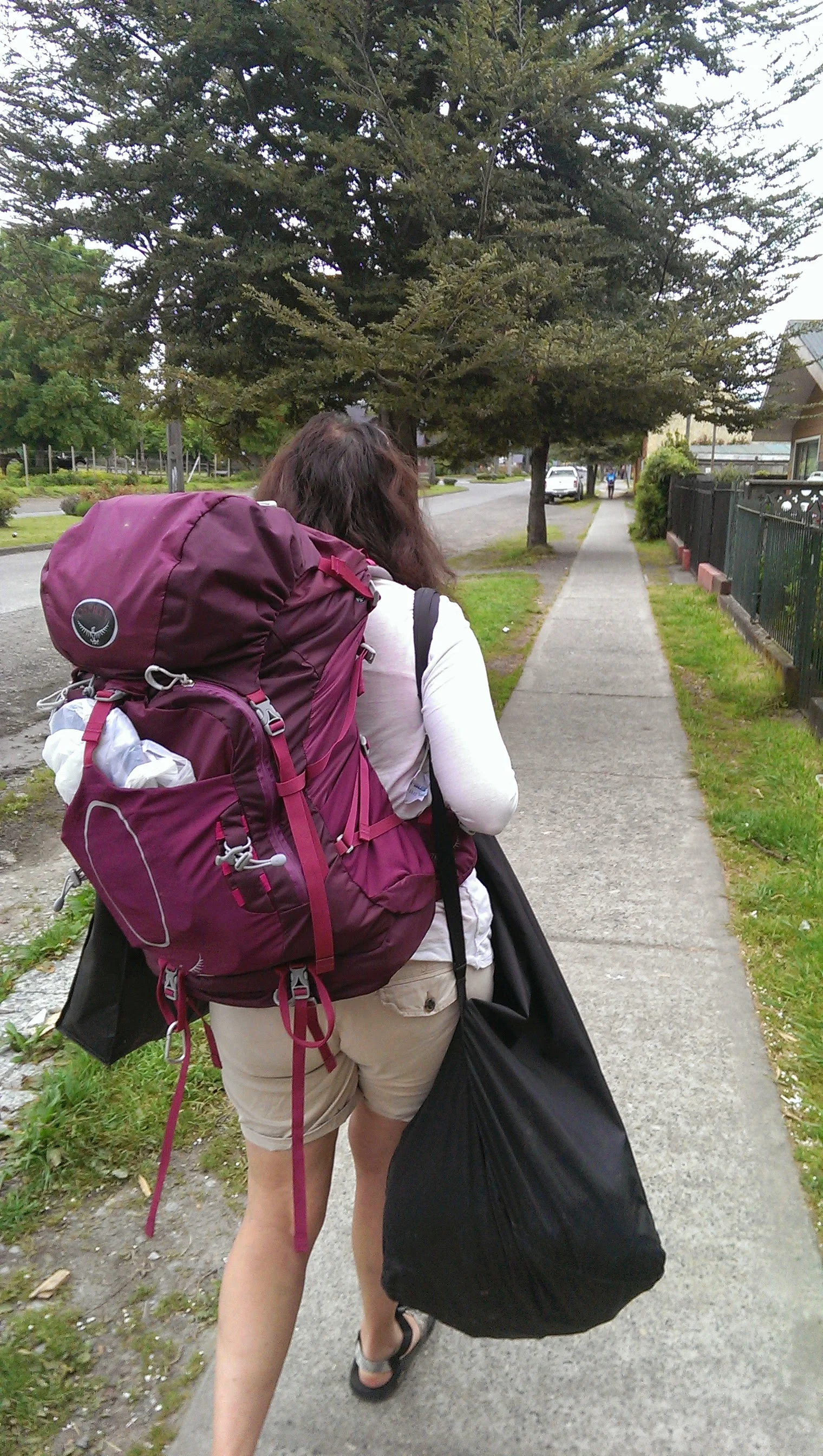 We bought some great travel gear when we began this trip. We had our super backpacks adjusted individually for our torsos and were ready to ascend any peak. As it turns out we could have made do with a Samsonite. We generally stuff our knapsacks haphazardly and throw the overflow into these big black bags that we bought to protect our backpacks during air transit. Kristin demonstrates our typical move above.